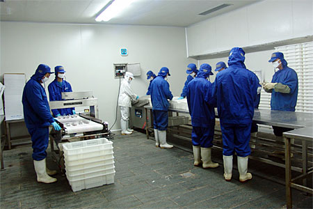 本公司是一家以水產品加工為主的出口型企業(yè),于2004年9月建成并正式投產。公司廠房完全按照歐洲聯(lián)盟的標準設計施工,目前占地14000平方米,建筑面積8000平方米,其中加工車間1600平方米。公司日速凍能力達100噸,儲藏庫容量為5000噸,主要加工蟹類、貝類、頭足類及魚蝦類水產品,產品銷往日本、東南亞及歐盟地區(qū)。